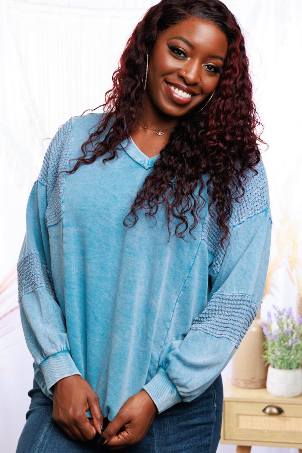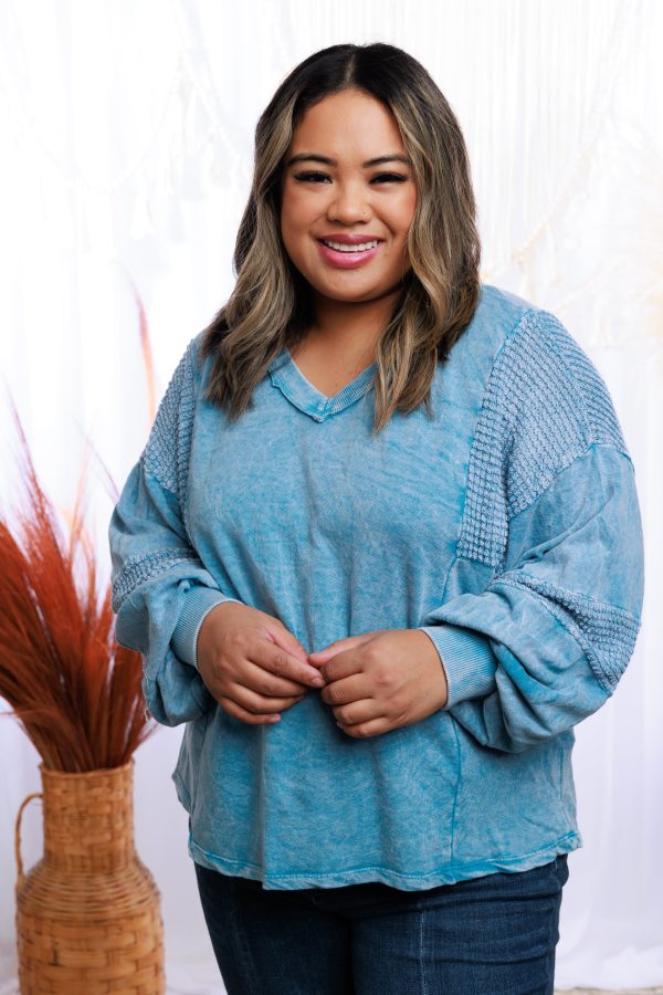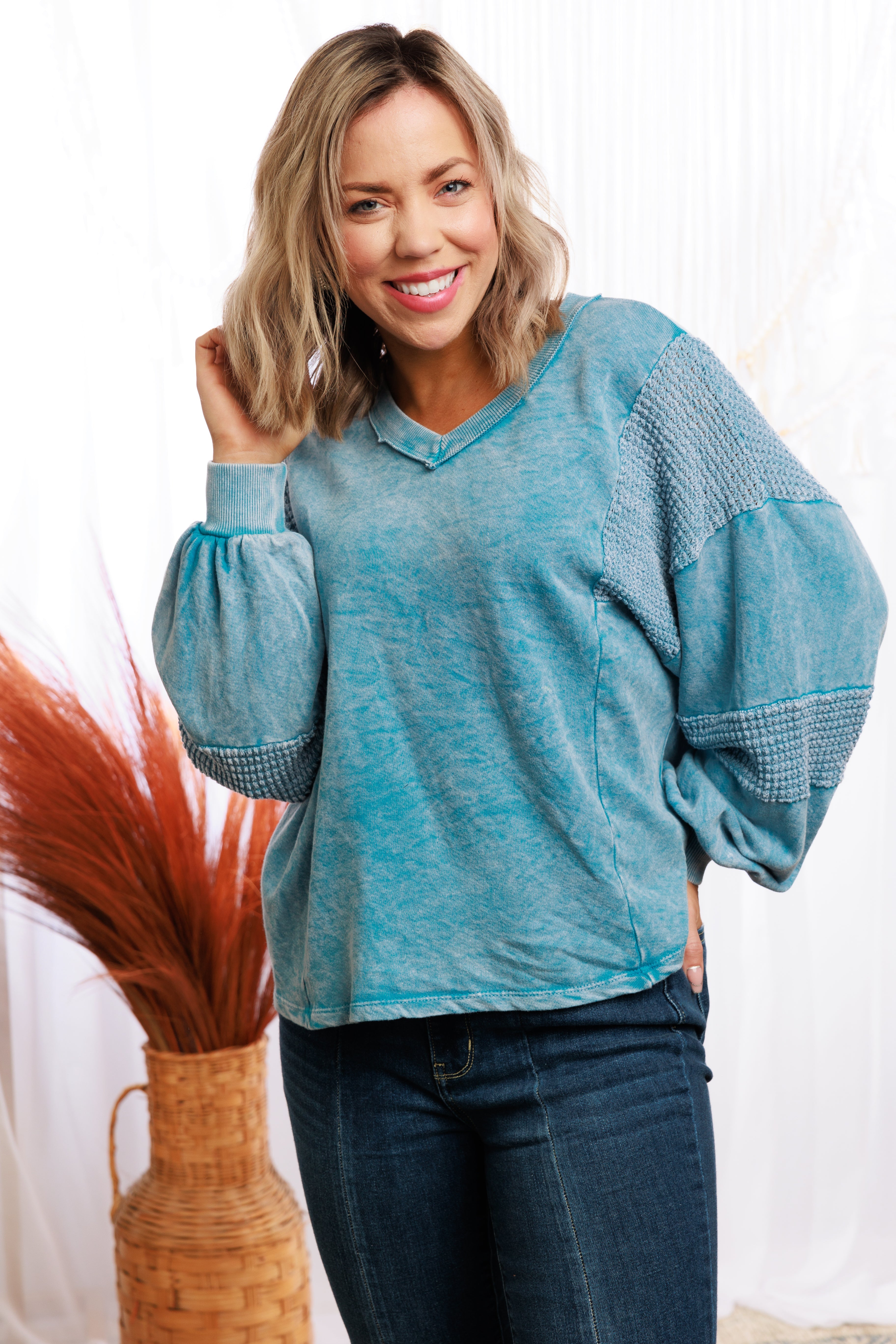 Show off your cool style with this Cropped Sweatshirt! It features an eye-catching mineral wash along with a v-neck, waffle fabric on the sleeve panel, and a cropped, oversized fit with long balloon sleeves. Get ready to turn some heads!
